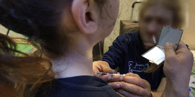 Με τρεμάμενα χέρια ο Γιάννης ‘χτυπάει’ το «ταϊλανδέζικο» στο εσωτερικό του αντιβραχίου. Οικογένειες με παιδιά, νεαρά ζευγάρια και μετανάστες περνούν, αλλά κανείς δεν νοιάζεται για το τι βλέπουν. «Εγώ πρέπει είτε να αγοράσω βελόνες από τους δρόμους ή να μοιραστώ μια και μετά να την ξεπλύνω με νερό», λέει ο Νίκος.