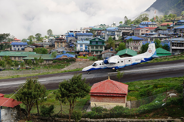 Tenzing-Hillary airport (Lukla airport), Nepal: an STOL aircraft taking off down the sloping runway