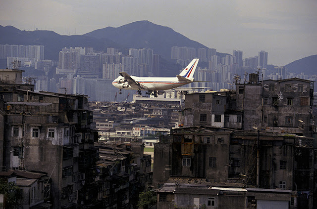 Kai Tak airport, Kowloon: a plane approaching the airport in 1992. The airport closed in 1998