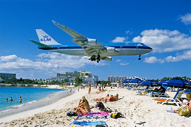 Princess Juliana international airport in Saint Martin: planes on a low approach over Maho Beach, located at the bottom of the Princess Juliana Airport strip
