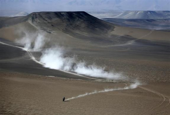 France’s Cyril Despres rides his KTM motorcycle during the second stage of the Dakar Rally 2013, from Pisco to Pisco, January 6, 2013.