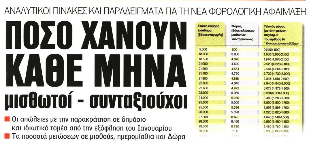 Από μειώσεις μισθών και συντάξεων μάλλον δεν πρέπει κανείς να παρακολουθεί πλέον γιατί χάθηκε ο μπούσουλας. Κόβουνε γιατί κόβουνε και πόσα κόβουνε κανείς δε ξέρει και φτάσανε οι μισθοί στο πάτο οι δε συντάξεις του ιδιωτικού τομέα ιδίως τα πλαφόν κάτω από το μισό. Δηλαδή αυτοί που πλήρωναν πάνω από 2.000 ευρώ το μήνα για κρατήσεις, τώρα παίρνουν γύρω στο χιλιάρικο. Ω τι κράτος δικαίου και αρπαχτής!