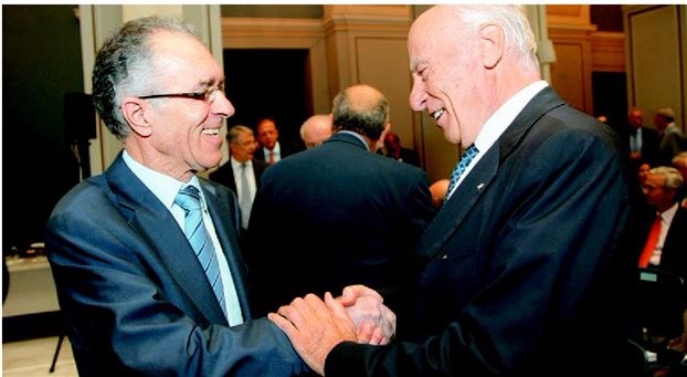 Οι πρόεδροι της Εθνικής Βασίλης Ράπανος και της Alpha Bank Γιάννης Κωστόπουλος χαιρετιούνται εγκάρδια. Τελικά, οι τράπεζές τους έμειναν έξω από τις μεγάλες συμφωνίες για Αγροτική και Ταχυδρομικό Ταμιευτήριο.