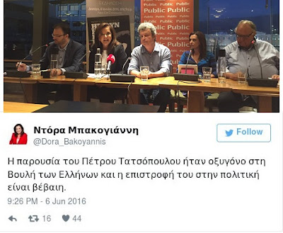 Ο άρχοντας της τεστοστερόνης είναι σταθερός στις πολιτικές του θέσεις. Ο ζεν πρεμιέ- έχω πάρει τις μισές από σας- Πέτρος Τατσόπουλος καταγγέλει τον ΣΥΡΙΖΑ του οποίου ήταν βουλευτής όταν ήταν πιο αριστερός απ’ ότι είναι σήμερα, ότι είναι πολύ αριστερός ή τουλάχιστον όχι τόσο δεξιός όσο θα ήθελε. Πρεζόνι της δημοσιότητας, μετρ της ασυναρτησίας. Ο Πέτρος Τατσόπουλος κοντεύει να συγκατοικήσει με τον Μπογδάνο, από τις τόσες εμφανίσεις στην εκπομπή του, επέλεξε τον Θόδωρο Πάγκαλο να παρουσιάσει το βιβλίο του και θέλει να μας πείσει ότι είναι σοβαρός άνθρωπος. Είναι άλλωστε κολλητός του άλλου σοβαρού πολιτικού όντος, του Θανάση Χειμωνά.