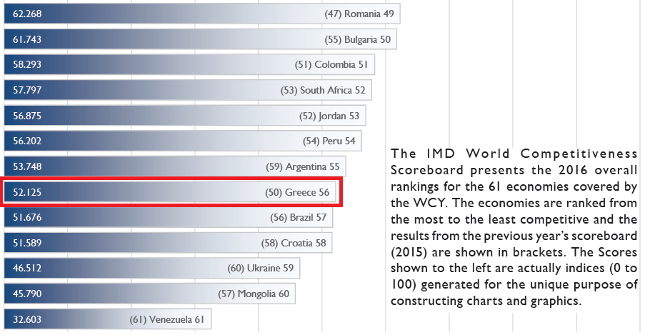 | Η ανταγωνιστικότητα της Ελλάδας από το World Competitiveness Yearbook 2016. Υποχωρήσαμε από την 50η στην 56η θέση ανάμεσα σε 61 χώρες. 57η η Βραζιλία των BRICS, 50η η Βουλγαρία. |