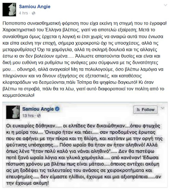 Συγκεκριμένα γράφει: «Ποποποπο συναισθηματική φόρτιση που είχα εκείνη τη στιγμή που το έγραφα! Χαρακτηριστικό του Έλληνα βλέπεις, γιατί να αποτελώ εξαίρεση; Μετά το συναίσθημα όμως έρχεται η λογική κι έτσι χωρίς να αναιρώ αυτά που ένιωσα και είπα εκείνη την εποχή, σήμερα χειροκροτώ όχι τις υποσχέσεις, αλλά τις μεταρρυθμίσεις! Όχι τα χαμόγελα, αλλά τη σκληρή δουλειά και τις αλλαγές έστω κι αν δεν βολεύουν εμένα….. Άλλωστε απαιτούνται θυσίες και είναι και δική μου ευθύνη να ρυθμίσω τις ανάγκες μου σύμφωνα με τις δυνατότητες μου…. οδυνηρό, αλλά αναγκαίο! Μη τα πολυλογούμε, όσο βλέπω λαμόγια να πληρώνουν και να δίνουν εξηγήσεις σε εξεταστικές, και καταθέσεις κλεφταράδων να δεσμεύονται, πάλι Τσίπρα θα ψηφίσω δαγκωτό! Κι όταν βλέπω τα στραβά, πάλι θα τα λέω, γιατί αυτό διαφοροποιεί τον πολίτη από το κομματόσκυλο!».