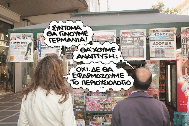 Αμ το άλλο, με τα εκτός τραπεζών μετρητά τί σας λέει; Να έχεις, ας πούμε, πέντε φράγκα στην καβάντζα και να πρέπει να τα δηλώσεις; Κι άμα αβγατίσουν ή λιγοστέψουν, να πρέπει να κάνεις σχετική δήλωση; Παναπεί, κάθε φορά που θα φεύγει ο ντελιβεράς, θα πρέπει να ενημερώνω το taxisnet ότι τα λεφτά στο πορτοφόλι μου λιγόστεψαν κατά ένα δεκάρικο; Κι άμα κερδίσω τον Μιχάλη στο τάβλι, θα πρέπει να ενημερώσω τον πίνακα “κέρδη από παίγνια” με το τάλληρο που θα του πάρω; Θα μου πείτε να μη τα δηλώσω. Κι άμα με σταματήσει στον δρόμο κανένας εφοριακός για έλεγχο και μου βρει πέντε ευρώ παραπανίσια στην τσέπη; Θα ‘ρθείτε εσείς να καθαρίσετε; Ε, ρε, μπερδέματα…