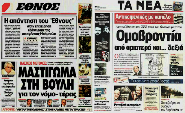 | Έθνος, 19/1/2005: Ο νόμος στοχεύει στην εξόντωση της οικογένειας Μπόμπολα. Τα Νέα, 20/1/2005: Το ΠαΣοΚ συμφωνεί με τον ΣΕΒ ότι ο νόμος είναι απαράδεκτος. |