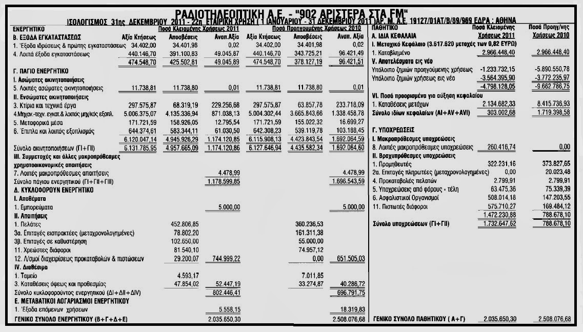 Ραδιοτηλεοπτική ΑΕ: Ο ισολογισμός τής 31/12/2011, με σωρευμένες ζημιές 4,8 εκατ. ευρώ. Αξιοσημείωτο είναι ότι η εταιρεία δεν χρωστάει δεκάρα σε τράπεζες. |