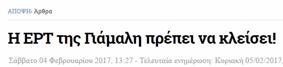 *** «H ΕΡΤ της Γιάμαλη πρέπει να κλείσει», έγραψε από τη «ναυαρχίδα» του «μητσοτακισμού, ο δημοσιογράφος Θανάσης Μαυρίδης. Στη χώρα που τα ιδιωτικά κανάλια εκπέμπουν παρατύπως σε δημόσιες συχνότητες και παρασιτούν εις βάρος του Έλληνα φορολογούμενου για σχεδόν τρεις δεκαετίες. Στη χώρα που η μονομερής «ενημέρωση» και η νεοφιλελεύθερη προπαγάνδα βαράει κόκκινο στα χρόνια του μνημονίου. Στη χώρα που κατασκευάζονται ειδήσεις για Ντίσνεϋλαντ και αποσιωπούνται μεσιτικές μπίζνες -εκτός πόθεν έσχες- στα Παρίσια. Στη χώρα που δεν ιδρώνει το αυτί κανενός όταν μια νέα δημοσιογράφος γίνεται βορά στον κάθε σεξιστή. Στη χώρα που όπου «μαύρο» και χαρά, η νεοφιλελέ Βασίλω πρώτη…
