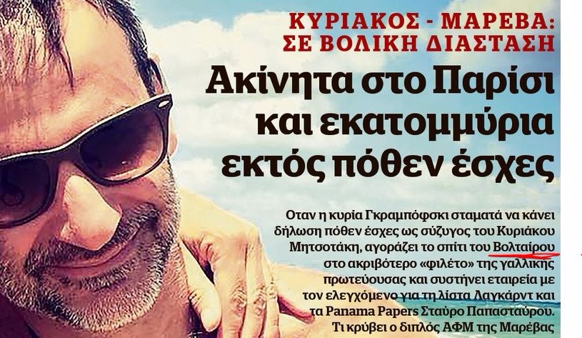 *** Τέσσερα ακίνητα μεταξύ των οποίων και το σπίτι του Βολταίρου, αγόρασε με 1,5 εκατομμύριο, η Μαρέβα Γκραμπόφσκι – Μητσοτάκη, το 2006. Κανένα μεμπτό ως εδώ, δικαίωμά της. Όπως όμως αποκαλύπτει η εφημερίδα Documento, λίγες μέρες πριν την αγορά αυτή, ο Κυριάκος Μητσοτάκης με πρόχειρο σημείωμα στην επιτροπή ελέγχου πόθεν έσχες είχε ενημερώσει πως με τη σύζυγό του βρίσκονται σε διάσταση και θα προχωρήσουν σε συναινετικό διαζύγιο. Ως εκ τούτου δεν συμπεριέλαβε -όπως ήταν υποχρεωμένος- τα περιουσιακά στοιχεία της συζύγου του στη δήλωση πόθεν έσχες. Την ίδια περίοδο και για 5 συναπτά έτη -και ενώ δεν πήραν τελικά ποτέ διαζύγιο- το πλούσιο πόθεν έσχες της συζύγου του -και συνεργάτη του Παπασταύρου– απουσίαζε από το δικό του.