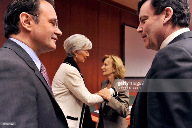 | Βρυξέλλες, Γιούρογκρουπ 14/2/2011: Ο Γιώργος Παπακωνσταντίνου συνομιλεί με τον Μπράιαν Λένιχαν. Στο φόντο οι υπουργοί οικονομικών Γαλλίας και Ισπανίας, Κριστίν Λαγκάρντ και Έλενα Σαλγάδο. |