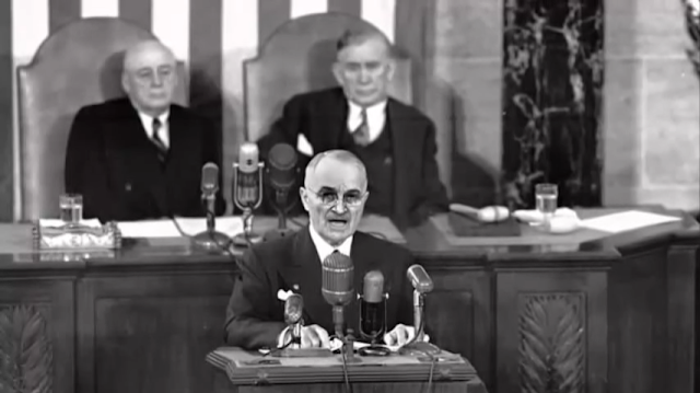 | Ο Χάρρυ Τρούμαν εκφωνεί το περίφημο διάγγελμα στο κονγκρέσσο των ΗΠΑ (12/3/1947). |
