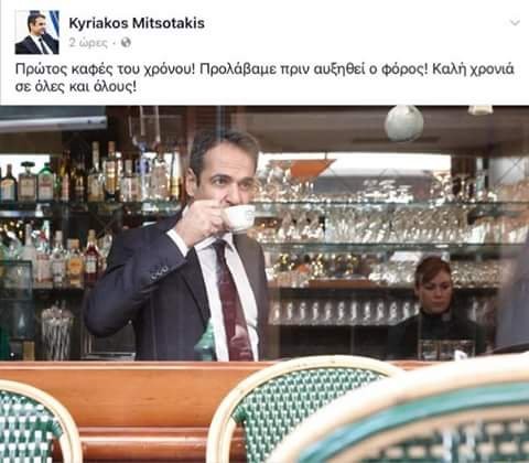 1. 1/1/2017: Καλή χρονιά και ο Κυριάκος πηγαίνει αχάραγα στο Κολωνάκι για να πιει τον φρέσκο καφέ του γλιτώνοντας την αύξηση του ΦΠΑ. Και το θεωρεί τόσο έξυπνο αυτό που μας το κοινοποιεί.