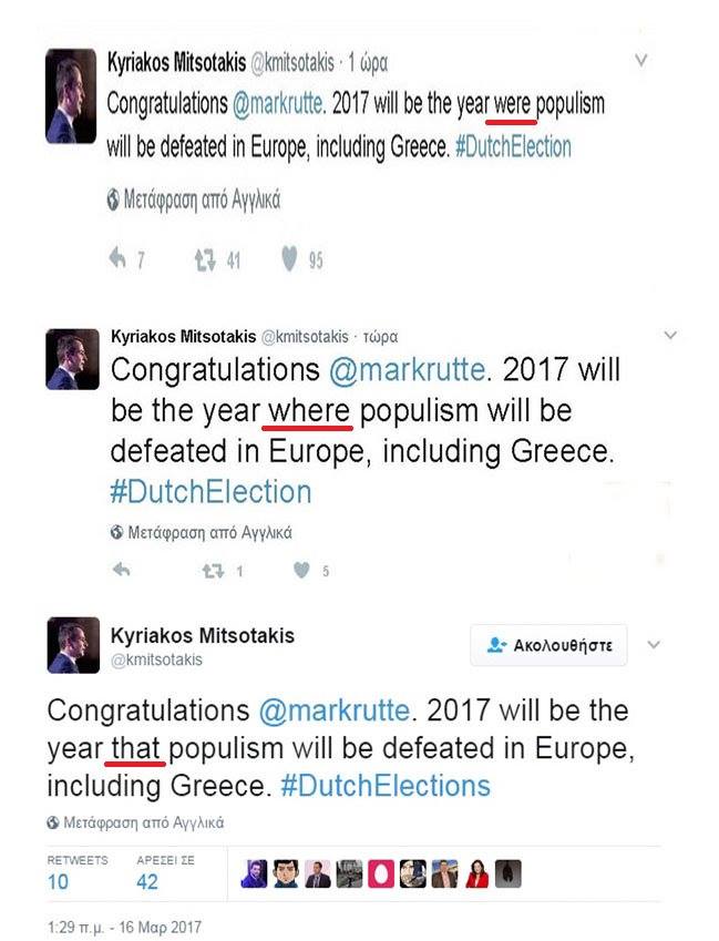 7.16/3/2017, ρεπετισιόν.Καλά, στο προφορικό το χάσαμε, στο γραπτό χάσαμε, αλλά το παιδί έχει δικαιολογία: τόσα χρόνια στην Αμερική, μπορεί να ξέχασε τα “λόγια” ελληνικά που τον βάζουν να πει. Τέτοιο πρόβλημα στον προφορικό λόγο είχε διαγνωσμένο και ο ΓΑΠ άλλωστε (5). Αλλά και τα γραπτά αγγλικά ρε Κυριάκο; Τέλος πάντων όταν ο ένας είναι ο εχθρός, ο λαϊκισμός ηττήθηκε (;)(6) στην Ολλανδία, ο Κυριάκος είπε τα συγχαρητήρια του σε τρεις φάσεις, μέχρι να πετύχει το κατάλληλο επίρρημα.