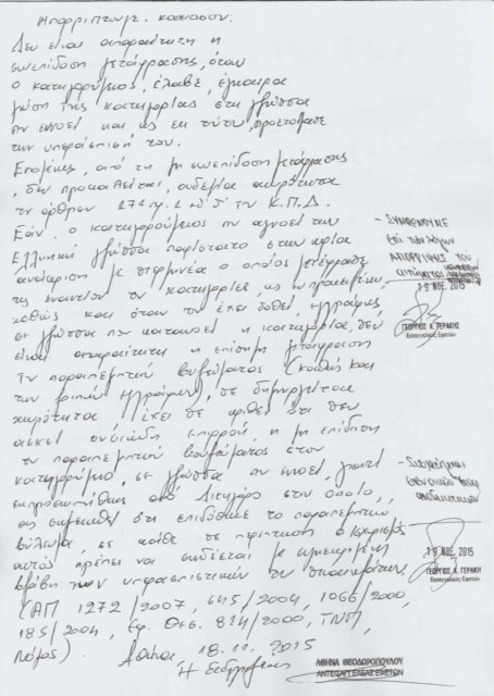 Η αντιεισαγγελέας Θεοδωροπούλου, απαντώντας στην αίτηση του κατηγορούμενου, σημείωνε πως δεν είναι απαραίτητη η επίδοση της μετάφρασης, με το σχετικό έγγραφο να συνυπογράφει ο εισαγγελέας Γεώργιος Γεράκης. Σημειώνεται ότι ο Γεώργιος Γεράκης είχε διατελέσει σύμβουλος του Υπουργού Δικαιοσύνης της κυβέρνησης Καραμανλή, Αναστάσιου Παπαληγούρα.