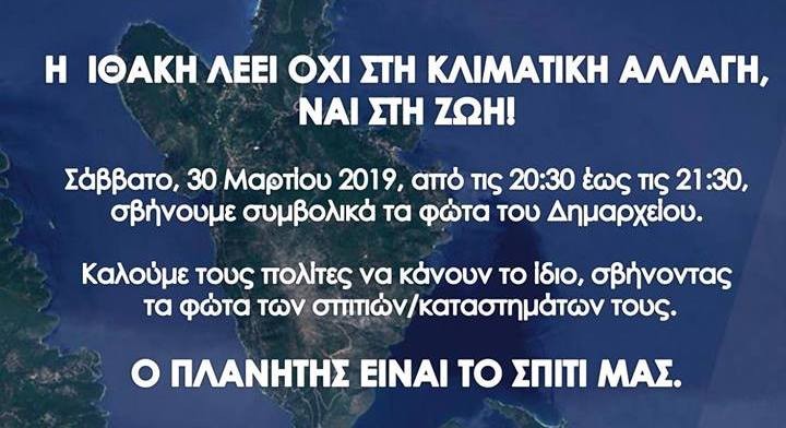 Το ΔΗΜΑΡΧΕΙΟ ΙΘΑΚΗΣ δεν θα φωταγωγηθεί για μια ώρα ως μια συμβολική δράση ευαισθησίας, ενδιαφέροντος και συνεισφοράς στην προστασία του νησιού μας, της χώρας μας και του πλανήτη από τις δραματικές συνέπειες της υπερθέρμανσης και της κλιματικής αλλαγής.
