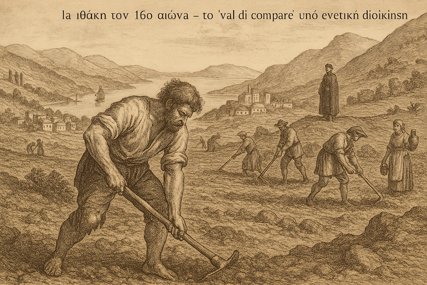 “val di compare – ιθάκη υπό ενετική διοίκηση, γύρω στο 1570. οι άνθρωποι σκάβουν, οι γυναίκες κουβαλούν νερό, τα καΐκια περιμένουν στο λιμάνι.”